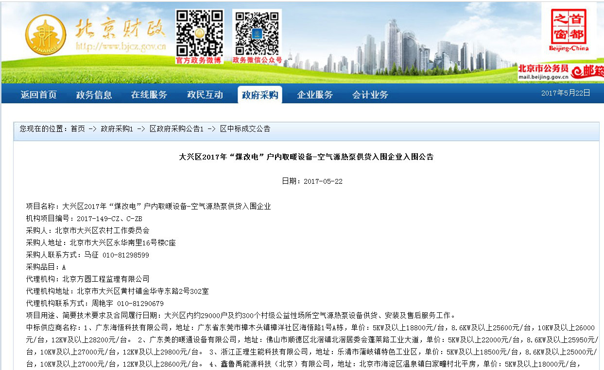 喜報丨鑫魯禹入圍2017年北京市大興區(qū)”煤改電”項目