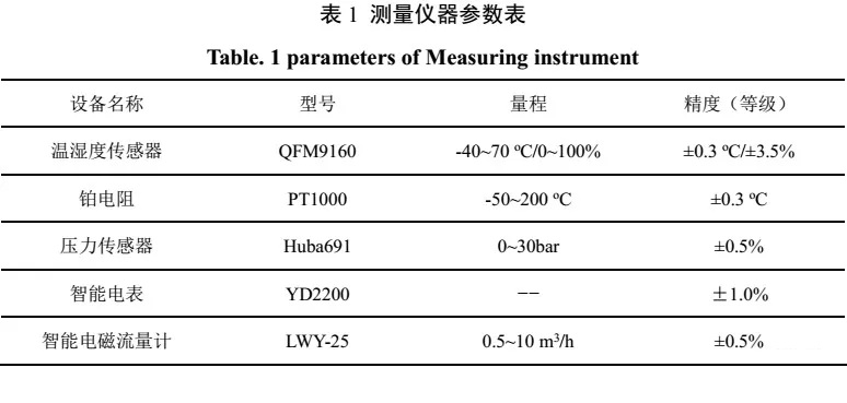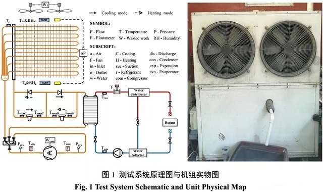 測試系統(tǒng)對空氣源熱泵的空氣側(cè)、制冷劑側(cè)與制取熱水側(cè)的運(yùn)行參數(shù)以及能耗情況進(jìn)行實(shí)時監(jiān)測。測試機(jī)組原理圖與實(shí)物圖如圖1中所示,在壓縮機(jī)吸/排氣管上分別設(shè)有溫度和壓力傳感器監(jiān)測壓縮機(jī)的吸/排氣溫度和壓力,在水側(cè)利用鉑電阻PT1000測量機(jī)組的進(jìn)/出水溫度,利用電磁流量計(jì)測量水流量。其中主要的測量儀器參數(shù)如表1所示。
