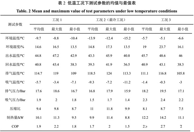 由表2可知,三個工況平均制熱量分別為:工況1為10.1kW,工況2為9.9kW,工況3為12.5kW,相對于額定制熱量19.6kW,機(jī)組制熱量的衰減幅度分別為48.5%、49.5%和36.2%,三個工況整體的平均制熱量10.7kW;經(jīng)統(tǒng)計(jì),三個工況總能耗量為167.4kWh;三個工況平均COP分別為:工況1為1.91,工況2為1.71,工況3為2.25,整體COP均值為1.96。其中,最冷工況下,當(dāng)溫度低至-15.2℃時,制熱量僅為8.8kW,衰減幅度高達(dá)到55%,COP僅為1.49。因此,低溫導(dǎo)致了機(jī)組的制熱量和COP嚴(yán)重衰減。