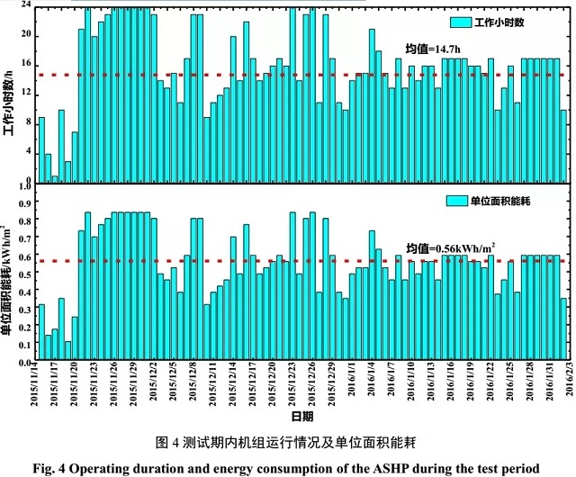 圖4為測試期內(nèi)空氣源熱泵每天的運(yùn)行時間和單位面積能耗。