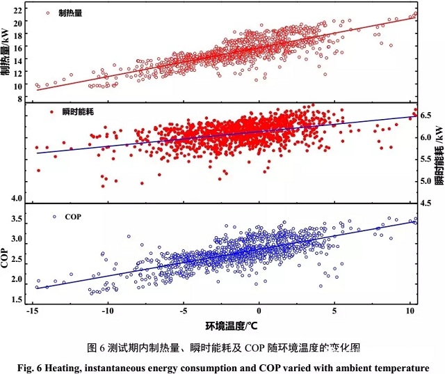 圖6為不同環(huán)境溫度下機(jī)組制熱量、瞬時能耗和COP的變化情況圖。
