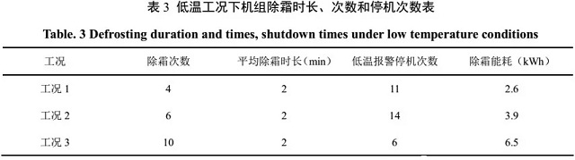 由此可見,低溫導(dǎo)致壓縮比超過正常范圍,對壓縮機(jī)的正常運(yùn)行產(chǎn)生了顯著的影響。機(jī)組除霜頻次及停機(jī)故障。機(jī)組除霜時長、次數(shù)及停機(jī)故障次數(shù)如表3所示。
