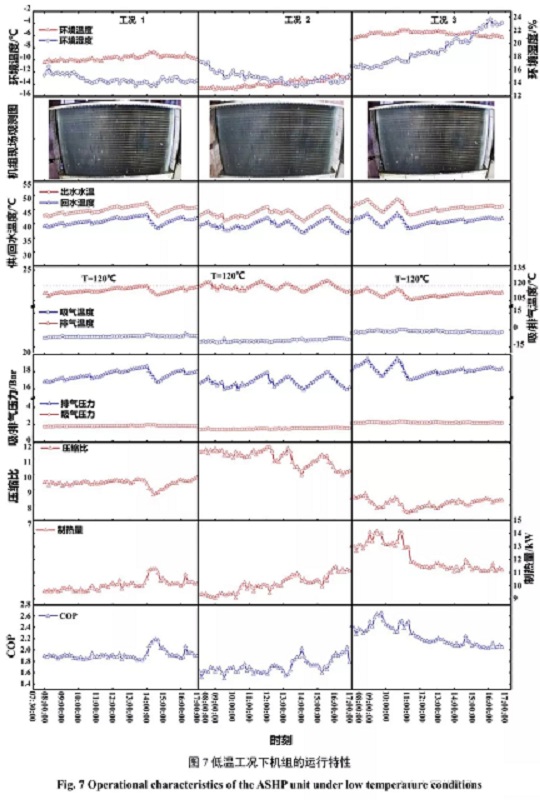 在測試期內(nèi),受強(qiáng)寒潮影響,北京地區(qū)2016年1月22日~2016年1月24日處于持續(xù)低溫黃色寒潮預(yù)警中,三天內(nèi)環(huán)境溫度在-15.2~-5.1℃范圍內(nèi)波動,平均溫度為-10.5℃。為分析熱泵系統(tǒng)在此低溫工況下的運(yùn)行性能,選取三個低溫工況,每個工況連續(xù)運(yùn)行9小時,依次從低溫工況,低溫運(yùn)行特性和低溫供熱性能三個方面進(jìn)行描述。表2為測試參數(shù)的詳細(xì)數(shù)值表,圖7為低溫期間空氣源熱泵各個工況的運(yùn)行結(jié)果。