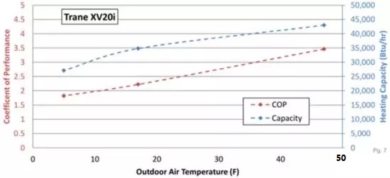 (圖1顯示了由Trane提供的具有報(bào)道的HSPF = 10(NEEP,2014)的XVASHi型號(hào)的ccASHP的加熱容量和COP值。)、