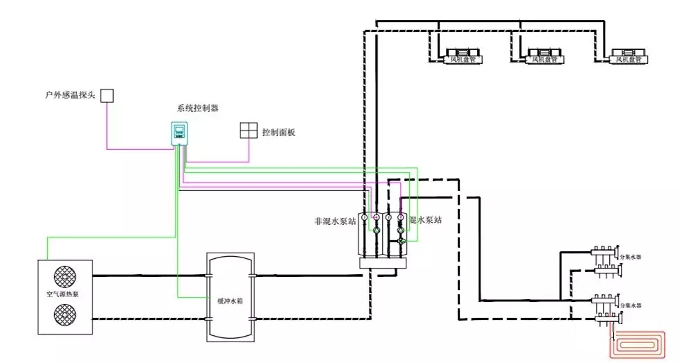 3、在設(shè)計(jì)兩聯(lián)供系統(tǒng)時(shí),務(wù)必考慮在水力平衡的前提下,風(fēng)機(jī)盤管和地暖可以同時(shí)開啟。
