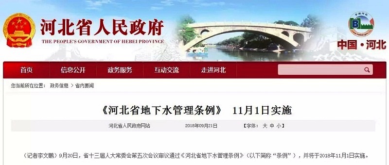 9月20日,《河北省地下水管理條例》在河北省第十三屆人民代表大會常務(wù)委員會第五次會議上獲高票通過,將于2018年11月1日實施!稐l例》規(guī)定: