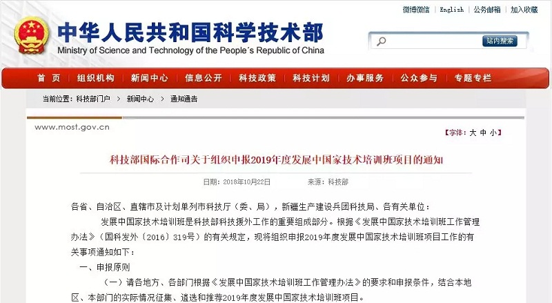 2018年9月30日,科技部國際合作司印發(fā)了《關(guān)于組織申報2019年度發(fā)展中國家技術(shù)培訓(xùn)班項目的通知》,指出申報重點技術(shù)領(lǐng)域:2019年度發(fā)展中國家技術(shù)培訓(xùn)班項目擬以成熟適用技術(shù)為主體,兼顧高新技術(shù)、科技政策與管理三類項目進(jìn)行支持。申報領(lǐng)域以農(nóng)林業(yè)、新能源與可再生能源、加工制造等領(lǐng)域為重點。