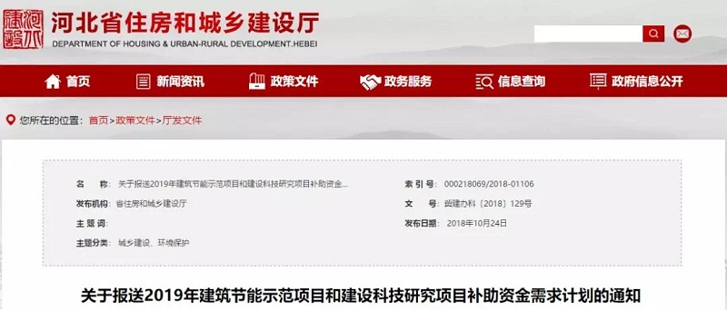 2018年10月24日,河北省住房城鄉(xiāng)建設(shè)廳辦公室印發(fā)《關(guān)于報送2019年建筑節(jié)能示范項目和建設(shè)科技研究項目補(bǔ)助資金需求計劃的通知》,指出在建筑節(jié)能示范項目方面,2019年省級建筑節(jié)能專項資金補(bǔ)助項目,原則上暫按《河北省建筑節(jié)能資金管理暫行辦法》(冀財建﹝2015﹞88號)、《關(guān)于省級建筑節(jié)能專項資金使用有關(guān)問題的通知》(冀建科﹝2017﹞34號)申報。其中二星級綠色建筑運(yùn)行標(biāo)識項目、可再生能源建筑應(yīng)用示范項目(空氣源熱泵項目)。