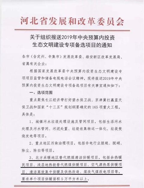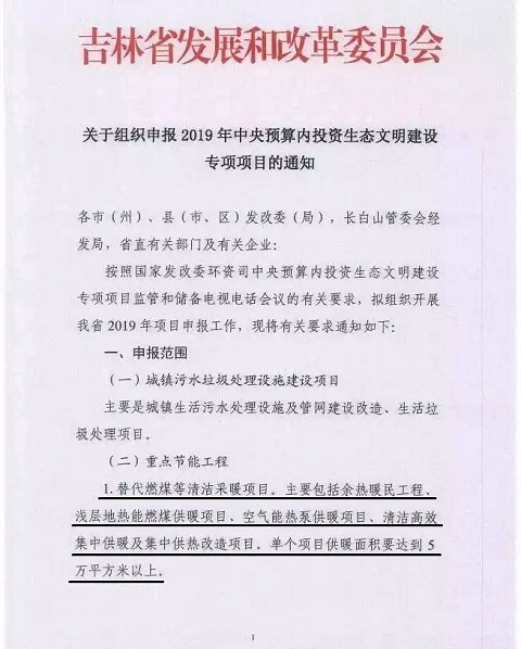 2018年7月31日,河南省發(fā)展和改革委員會印發(fā)《關(guān)于組織申報2019年中央預(yù)算內(nèi)投資生態(tài)文明建設(shè)專項備選項目的通知》,指出專項備選重點為北方采暖地區(qū)替代燃煤清潔供暖項目,主要包括余熱暖民工程、淺層地?zé)崮芴娲济汗┡椖,空氣源熱泵供暖項目,清潔高效集中供暖及集中供熱改造項目,單個項目的供暖面積要達(dá)到5萬平方米以上。