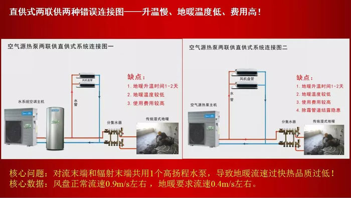 其次,導(dǎo)致對兩聯(lián)供技術(shù)不成熟的誤解原因:不重視地暖末端及流速、誤認(rèn)為水箱的主要功能是蓄熱而非降低流速、不重視聯(lián)動溫控等造成的。