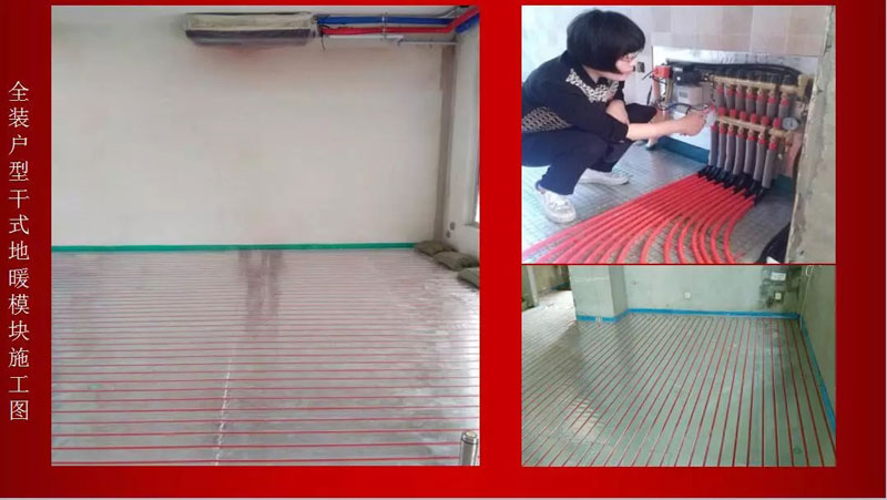 混裝戶型采用二次分水器、局部保護、水電聯(lián)動、地磚后貼四種過管工藝。地磚區(qū)模塊在貼磚前鋪設(shè),可與主管道一并施工;地板區(qū)模塊在鋪地板前鋪設(shè),與主機一并施工;不用水泥回填干式地暖施工配合相對更簡單!