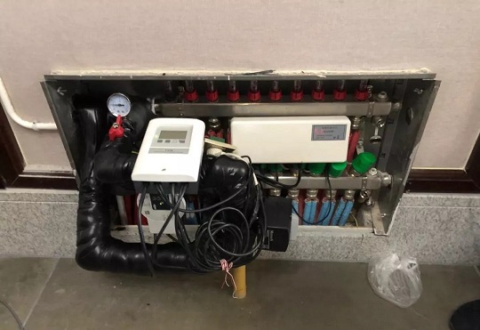 在分集水器前端加裝了混水中心,全自動(dòng)化調(diào)節(jié)地暖供水溫度,實(shí)現(xiàn)氣候補(bǔ)償技術(shù)。室內(nèi)裝有中央控制器,溫濕度露點(diǎn)控制面板,夏季地板可制冷,處理圍護(hù)結(jié)構(gòu)負(fù)荷,實(shí)現(xiàn)露點(diǎn)保護(hù)技術(shù)。室外部分PUN601離心泵,影響混水閥出水的準(zhǔn)確度,更換為PUN200離心泵泵,降低外置水泵對(duì)混水閥的影響,同時(shí)降低了運(yùn)行能耗。二次側(cè)只用一臺(tái)15-8的高效泵負(fù)責(zé)末端循環(huán),調(diào)試時(shí)分集水器流量計(jì)顯示3L/min說明地暖側(cè)水流量充足。