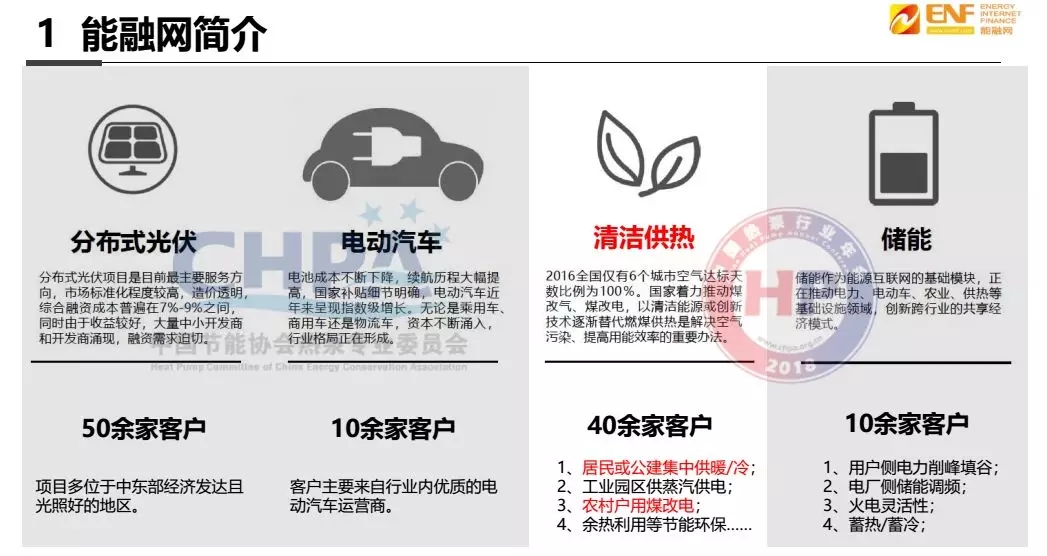 能融網(wǎng)是一個專門針對綠色能源的投融資服務平臺,服務范圍包含分布式光伏、電動汽車、清潔供熱、儲能四大領域。自2017年初,我們開始關注清潔供熱領域,主要分為工業(yè)供熱和居民供熱兩個方向。工業(yè)園區(qū)供熱是最早突破的領域,不過隨著近幾年來“煤改電”的發(fā)展,我們的重點開始轉向了居民供熱。