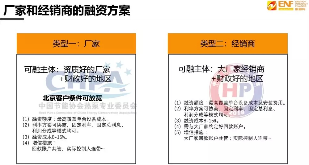 農村“煤改電”除北京以外,對其他地方的政策看的不是很明白,簡單來說就跟其他BOT項目一樣,項目建成后,廠家沒有產(chǎn)權和收益權,所以這一塊我們在做,但是做的并不多?扇谥黧w可以分為資質好的廠家和大廠家的經(jīng)銷商兩類(財政好的地區(qū)),北京客戶條件可以放寬。