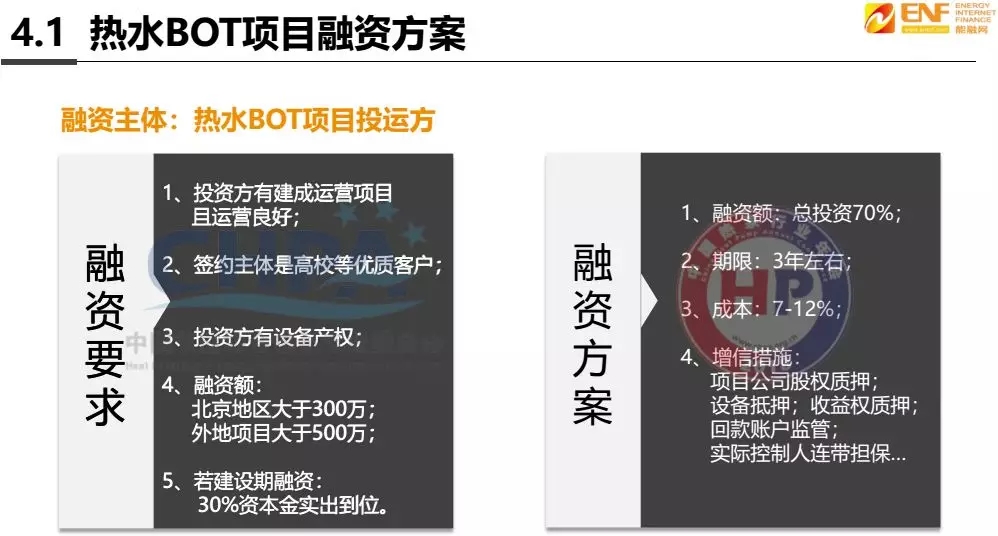 在熱水BOT方面,今年年初我們陸續(xù)接觸這樣的項目,只不過到目前為止沒有規(guī)模化的項目包。具體融資要求是: