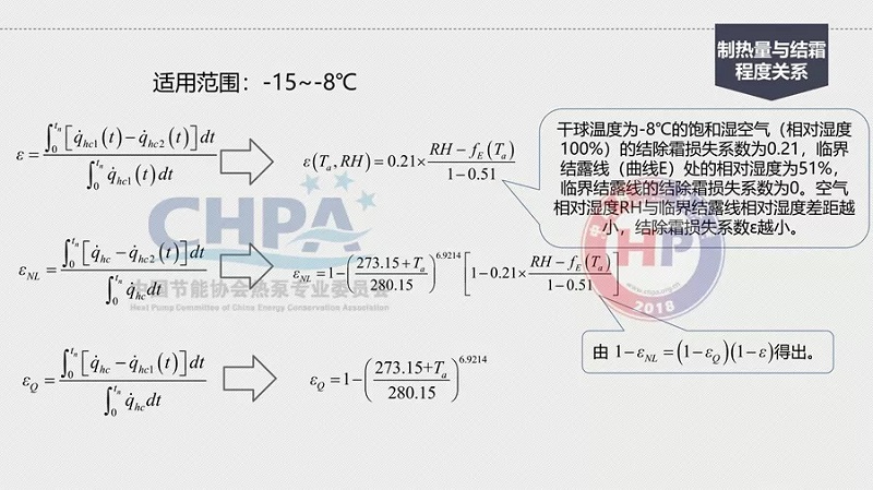 在-15℃到-8℃數(shù)學(xué)模式的圖上可以看到,結(jié)霜的損失系數(shù)用一個(gè)符號(hào)來代表,結(jié)霜的損失一定影響了它的名義制熱量,所以,它有一個(gè)損失系數(shù),會(huì)影響到整個(gè)制熱量的衰減。有了數(shù)學(xué)模型就可用進(jìn)行數(shù)學(xué)計(jì)算,去解決這樣的物理現(xiàn)象。
