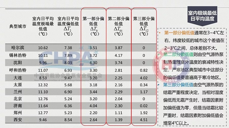 在室內(nèi)溫度降低的情況下,通常室外計(jì)算溫度需要考慮這些問題。如哈爾濱和呼和浩特基本上屬于寒冷地區(qū)的B區(qū),其可以不用降低,就按照規(guī)定的室外溫度就可以了,但是到了嚴(yán)寒地區(qū)的C區(qū),涉及到的偏差比較大,一般都是差2℃,像西安差3℃多。同時(shí),空氣源熱泵結(jié)除霜工況制熱量只允許在5天時(shí)間內(nèi)不滿足建筑需熱量。室內(nèi)日平均溫度只允許有5天不保證室內(nèi)設(shè)計(jì)溫度18℃。