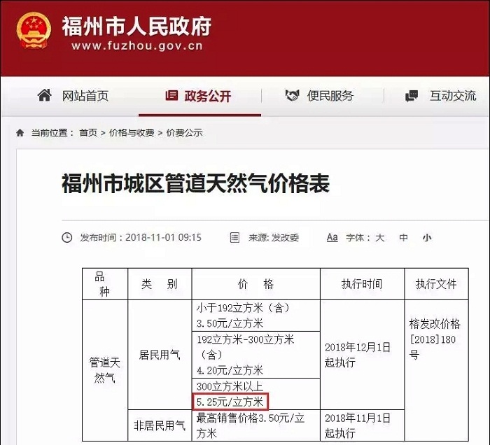根據(jù)福州市政府官網(wǎng)顯示,從2018年12月1日開始,福州民用天然氣價格調(diào)整。銷售價格由之前的3.18元/m3調(diào)整為3.50元/m3。具體階梯氣價為:小于192m3(含),3.50元/m3;192m3-300m3(含),4.20元/m3;300m3以上,5.25元/m3。